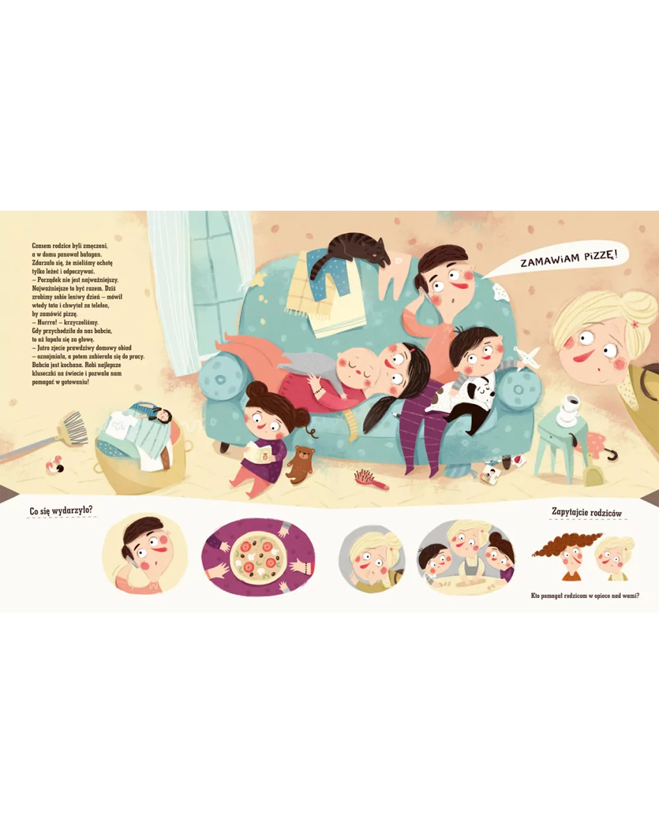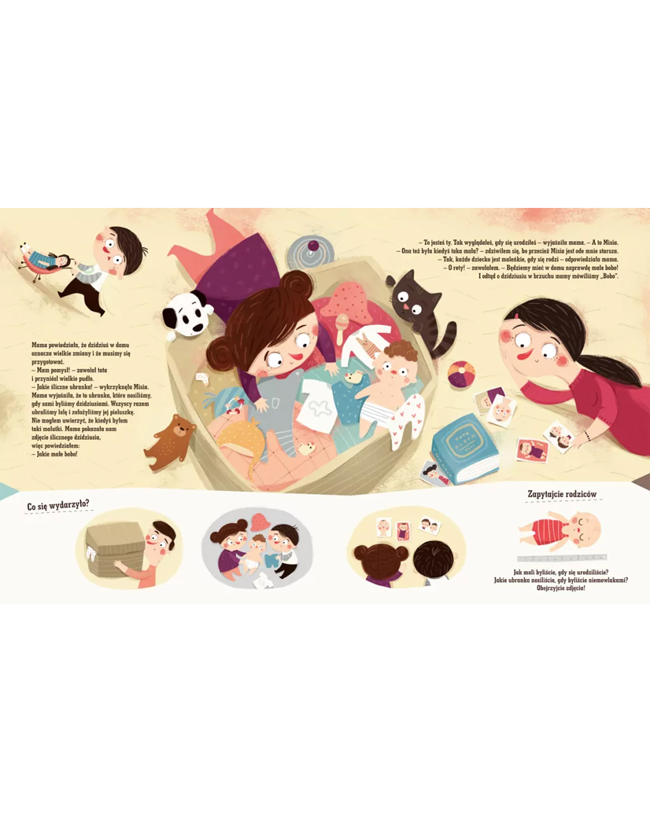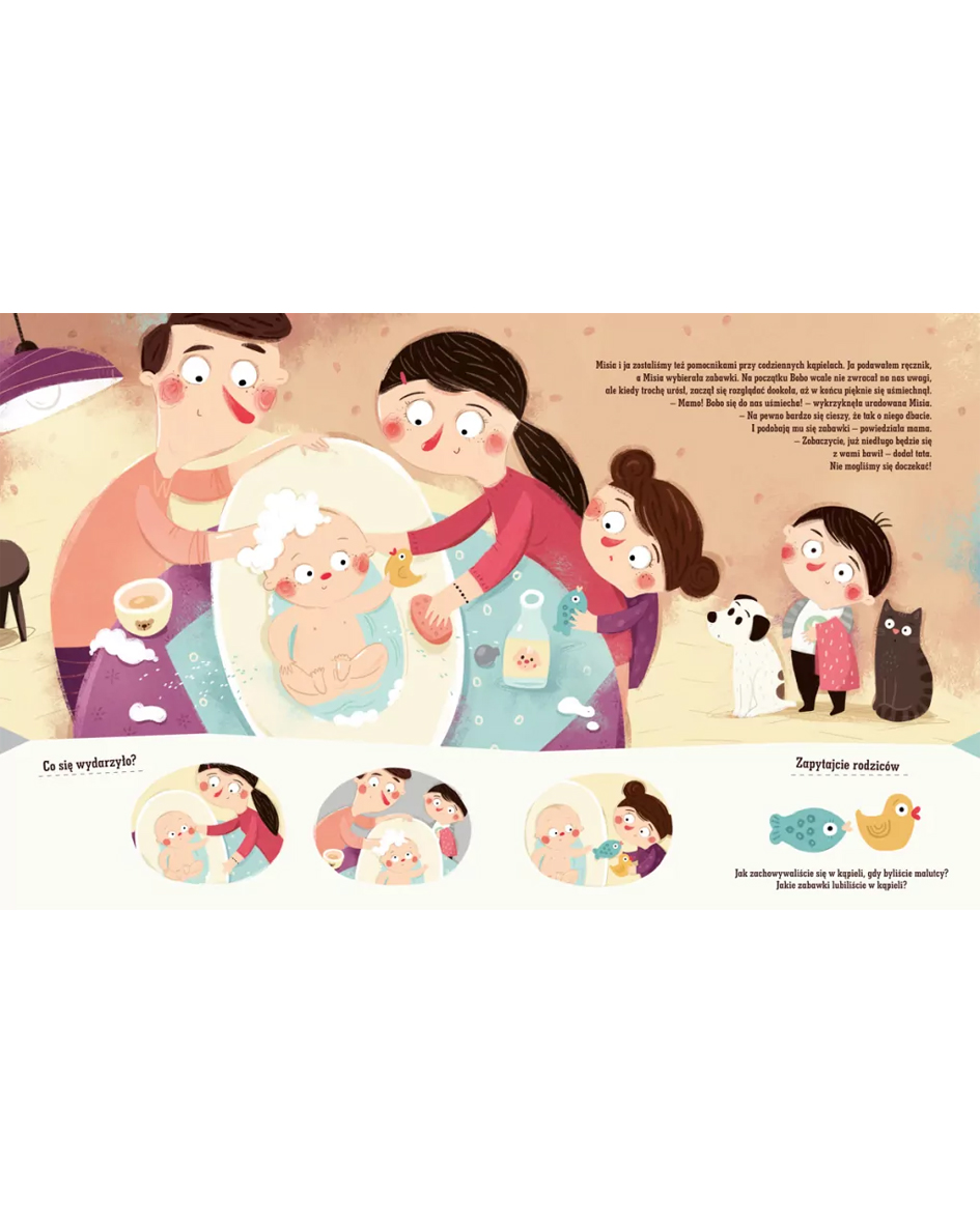 Under each illustration, you’ll find additional pictures encouraging the child to create their own story about Pucio’s adventures. First, children learn about the experiences of the book’s characters, and then they try to tell their parents about them. This is a great exercise that helps young children understand how causes and effects are connected in a story and how to tell a story so that listeners can understand everything well. By asking questions like “What happened at the beginning?”, “What did Pucio do next?” and “Why?”, you will further engage children in storytelling and encourage them to speak.