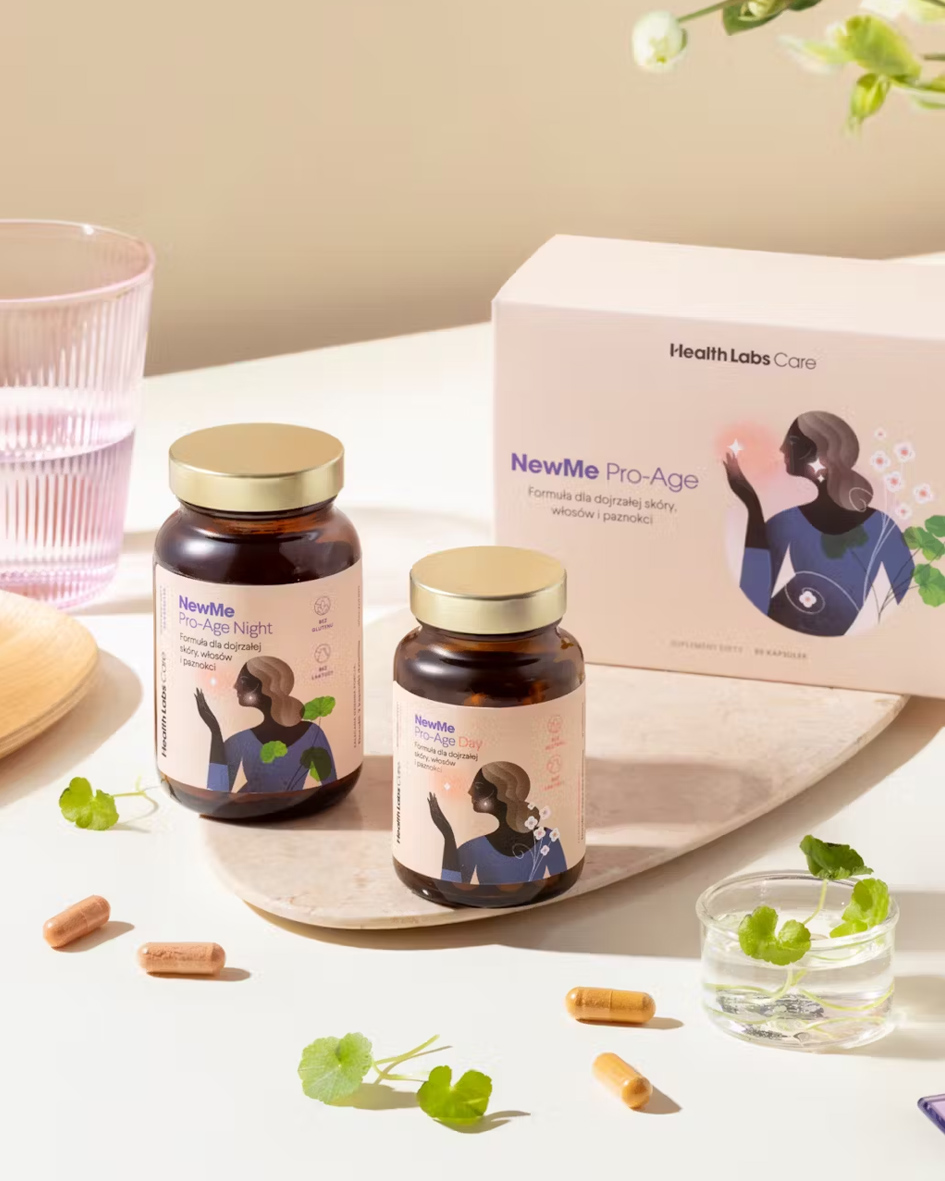 What makes the NewMe Pro-Age dietary supplement stand out? Complex composition and richness of antioxidants The NewMe Pro-Age dietary supplement contains plant extracts: from algae (including astaxanthin), green tea (including EGCG), and gotu kola (Centella asiatica), minerals, as well as vitamins E and C, which help protect cells from oxidative stress. Highly absorbable collagen and sodium hyaluronate The composition of the NewMe Pro-Age dietary supplement is complemented by sodium hyaluronate (hyaluronic acid) with a low molecular weight, making it easier to absorb, and collagen from codfish with vitamin C, which helps in the proper production of collagen to ensure the proper functioning of the skin. Complementary action of ingredients The Day&Night formula takes into account the synergism of ingredients, and thanks to biologically active forms with high absorption and standardized plant extracts, the NewMe Pro-Age dietary supplement complements the diet with vitamins and minerals important for the health of mature skin and hair.