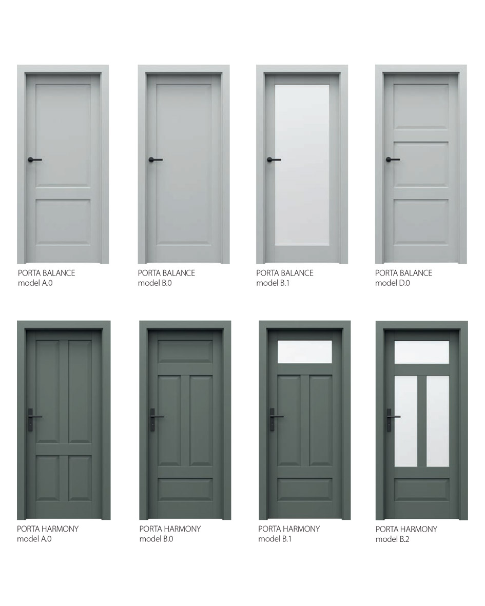 The internal doors from the PORTA HARMONY collection feature panels made of horizontal rails, between which – depending on the model – there are panels or matte glass panes made of 4 mm thick tempered glass. You can choose from several available models, either solid or with glazing. Models A.0, B.0, and C.0 have a fully enclosed structure with decorative panels filling the space between the rails. Models B.1 and C.1 offer small glass panels in the upper part of the door. In models A.1 and B.2, the glazing occupies a larger area – model A.1 has two narrow vertical glass panels in the form of rectangles running along the door, allowing additional sunlight to brighten the interior.