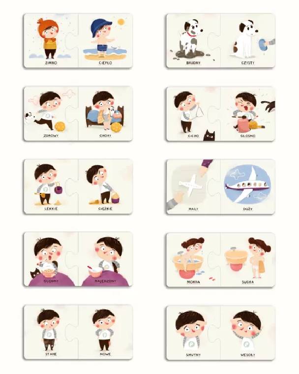 How to use the Pucio. Opposites set? The Pucio. Opposites set consists of 20 elements, i.e., 10 pairs of pictures, among which you need to find opposites: small and large, old and new, wet and dry, healthy and thin, sad and happy, hungry and full, light and heavy, cold and warm, quiet and loud, dirty and clean. This seemingly simple task requires focusing on the charming illustrations, stimulates thinking, and provides interesting, educational fun for long hours. Each picture engages in learning words, being a starting point for creating whole stories that can be discussed with parents or peers. The toy also perfectly complements the Pucio books, inspiring various activities.